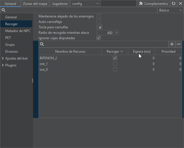 Pick palladium: Seleccionando esta opción recogerá paladio mientras mate los battlerays, debes tener activo el recurso ore_8 con un tiempo de espera 750ms.